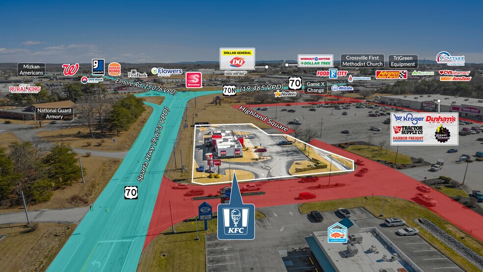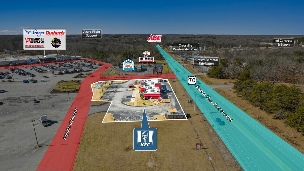 Sands Investment Group is pleased to exclusively offer for sale the 3,931 SF KFC located at 410 Highland Square in Crossville, TN. The property is secured by a 20-year Absolute Triple Net (NNN) Lease with approximately 18 years of primary term remaining, plus 3, 5-year renewal options, providing investors with a long-term, stable, and truly passive income stream. This offering presents an opportunity to acquire a corporately recognized quick-service restaurant asset with strong brand credit, minimal landlord responsibilities, and predictable annual rental growth.
