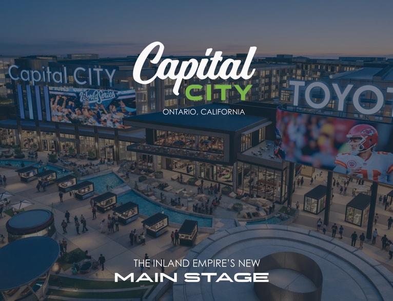 Capital City is a brand-new, mixed-use project which will transform Ontario's city center and elevate the dining and entertainment experience in the Inland Empire. The initial phase of the project will feature hundreds of luxury residential units with ~25K SF of prime restaurant space at ground level parallel to Toyota Arena, with the City's brand-new 80K SF public plaza between. Construction on the initial phase is well underway with delivery slated for Q1 2027. Future phases to follow. Adjacent to Toyota Arena, between the 10 and 15 freeways, in the heart of the Inland Empire.
