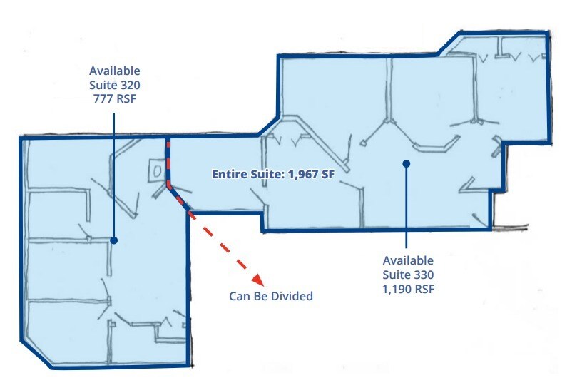 777 SF Suite - 5 private offices, sink and reception area. 1,190 SF Suite - 4 larger private offices, storage and reception area.