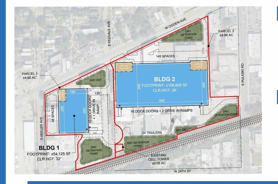 4041-4179 W. Ogden Avenue is a 15 acre site located in Chicago, which can accommodate two class A industrial facilities up to 54,125 SF and 168,800 SF. Proposed building 2 can be up to 168,800 SF with potential office of 13,200 SF, 36' clear height, 16 dock doors, 2 drive in doors, 185' truck court, 145 car parking, and 24 trailer parking.