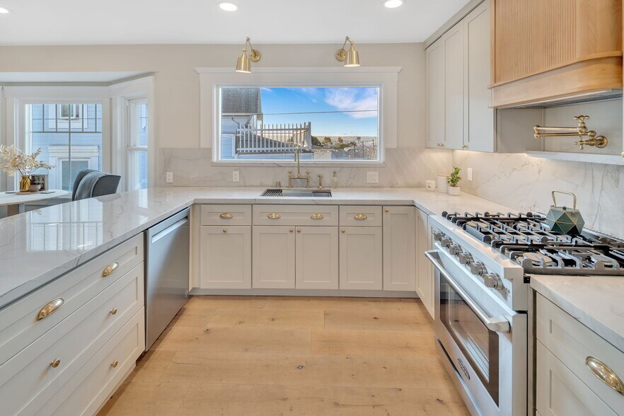 - High end finishes include dual pane windows, brass fixtures, engineered hardwood floor, dual shower heads in primary bathroom, walk-in closet, laundry