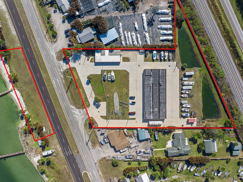 The property consists of a three-parcel assemblage totaling nearly 2.5 acres with direct Indian River frontage, offering beautiful water views and approximately 310 feet of dock frontage along with an existing 4-foot wood dock. It features prominent US-1 frontage that provides excellent visibility and access, and is zoned for retail use (buyer to verify allowable uses and density). Conceptual phased development plans have already been completed. Existing masonry improvements include a ±2,240 SF freestanding retail building and ±8,280 SF of mini-storage buildings comprising 27 units, providing strong interim-use potential. The site also offers ample on-site parking throughout and is offered for land and building value only, with the possibility of business operations and financials being considered separately.