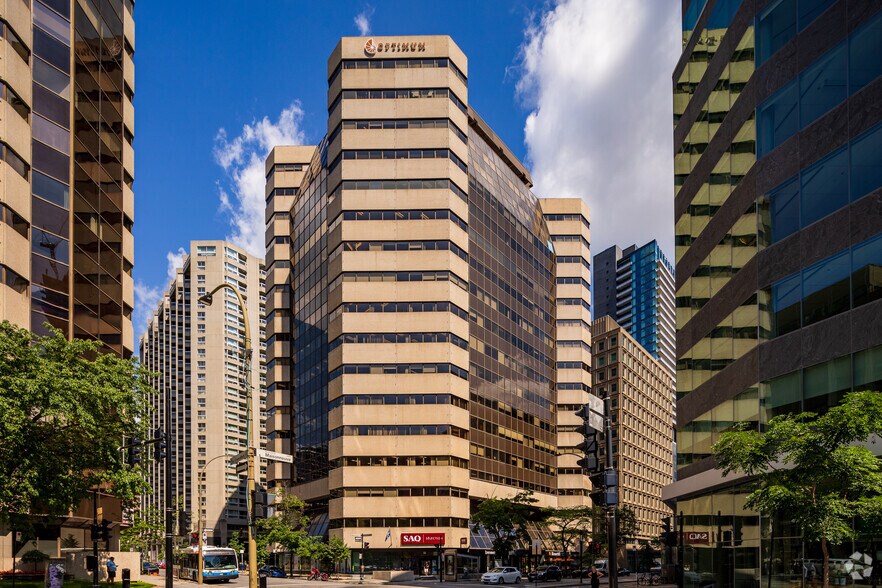 Tour de bureaux de 17 étages sur le boulevard De Maisonneuve Ouest avec une bonne fenestration, une luminosité abondante et une vue sur le centre-ville.