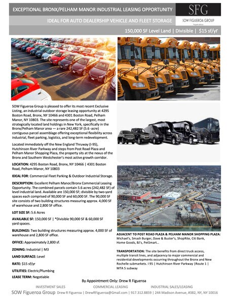 SOW Figueroa Group is pleased to offer its most recent Exclusive Listing, an industrial outdoor storage leasing opportunity at 4295 Boston Rd, Bronx, NY 10466 and 4301 Boston Rd, Pelham Manor, NY 10803. The site represents one of the largest, most strategically located land holdings in New York, specifically in the Bronx/Pelham Manor area — a rare 242,482 SF (5.6 -acre) contiguous parcel assemblage offering exceptional flexibility across industrial, fleet parking, logistics, and long-term redevelopment. Located immediately off the New England Thruway (I-95), Hutchinson River Parkway and steps from Post Road Plaza and Pelham Manor Shopping Plaza, the property sits at the nexus of the Bronx and Southern Westchester's most active growth corridor. The site benefits from direct truck access, multiple transit lines, and adjacency to major commercial and residential developments occurring throughout the Bronx and New Rochelle submarkets. LOCATION: 4295 Boston Road, Bronx, NY 10466 | 4301 Boston Road, Pelham Manor, NY 10803 IDEAL FOR: Commercial Fleet Parking & Outdoor Industrial Storage. DESCRIPTION: Excellent Pelham Manor/Bronx Commercial Leasing Opportunity. The combined parcels contain 5.6 acres (242,482 SF) of level industrial land. Available are 150,000 SF; divisible by two-yard spaces each comprised of 90,000 SF and 60,000 SF. The 90,000 SF site consists of two building structures measuring approx. 4,000 SF of warehouse and 2,800 SF office. LOT SIZE SF: 5.6 Acres AVAILABLE SF: 150,000 SF | *Divisible 90,000 SF & 60,000 SF yard spaces. BUILDINGS: Two building structures measuring approx. 4,000 SF of warehouse and 2,800 SF office. OFFICE: Approximately 2,800 sf. ZONING: Industrial | M3 LAND SURFACE: Level RATE: $15 sf/yr UTILITIES: Electric/Plumbing LEASE TERM: Negotiable ADJACENT TO POST ROAD PLAZA & PELHAM MANOR SHOPPING PLAZA: Michael’s, Smash Burger, Dave & Buster’s, ShopRite, Citi Bank, Home Goods, BJ’s, PetSmart… TRANSPORTATION: The site benefits from direct truck access, multiple transit lines, and adjacency to major commercial and residential developments occurring throughout the Bronx and New Rochelle submarkets. I 95 | Hutchinson River Parkway | Route 1 MTA 5 subway