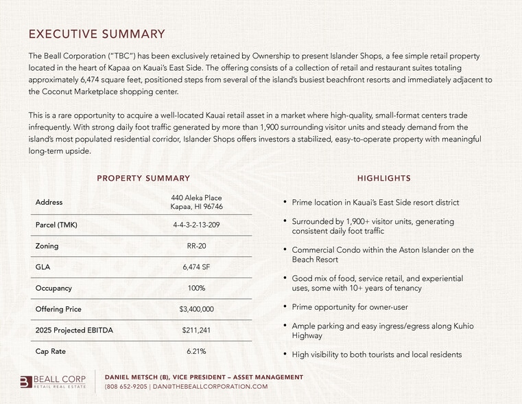 The Beall Corporation (“TBC”) has been exclusively retained by Ownership to present Islander Shops, a fee simple retail property located in the heart of Kapaa on Kauai’s East Side. The offering consists of a collection of retail and restaurant suites totaling approximately 6,474 square feet, positioned steps from several of the island’s busiest beachfront resorts and immediately adjacent to the Coconut Marketplace shopping center.