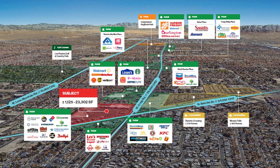 LOGIC Commercial Real Estate a le plaisir de présenter le centre commercial Rancho Sierra, un centre commercial de +/- 318 326 pieds carrés situé à l'intersection signalisée entre W. Craig Rd et N. Rancho Dr. Le centre commercial Rancho Sierra abrite une rare grande surface de +/- 73 059 pieds carrés d'ancienne épicerie Smiths Grocery disponible à la location. Situé à moins de 1,6 km de l'autoroute US-95, cet établissement bénéficie d'un trafic élevé dépassant +/- 57 000 CPD à l'intersection. Le propriétaire est motivé à louer des locaux et propose de généreuses allocations d'amélioration locatives et des loyers gratuits aux locataires qualifiés.
