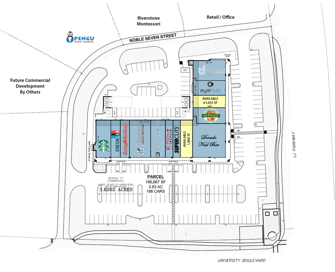 Centre commercial de 27 750 pieds carrés en face du 165 000 mètres carrés Kroger Center et du CVS. Situé entre University Blvd et LJ Parkway, l'intersection principale de la communauté planifiée de Riverstone (www.riverstone.com). Quartier aisé avec un revenu familial moyen supérieur à 199 000 dollars dans un rayon de cinq kilomètres autour de la propriété.