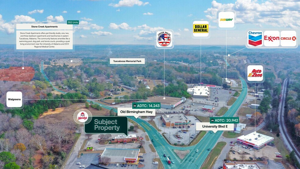 Surmount is pleased to present the exclusive listing for a Wendy’s located at 4422 Old Birmingham Highway, Tuscaloosa, AL 35404. The site consists of roughly 3,158 rentable square feet of building space on an estimated 1.19-acre parcel of land. Wendy’s is subject to a 15-year lease, which commenced 6/1/2024. The current annual rent is $156,750 and has scheduled increases of 6.00% Every 3 Years.