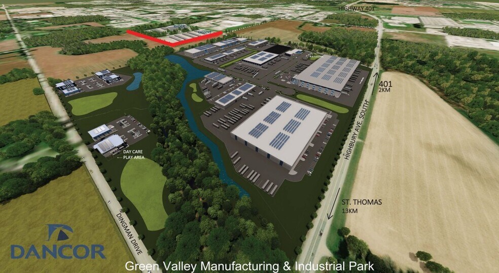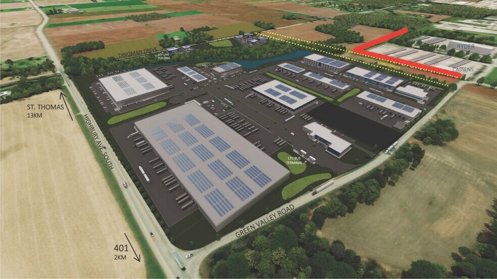 High profile prominent corner at Green Valley Road and Highbury Ave with easy access to Highway 401. Phase 1 has many different industrial options available, from approximately 19,000 SF up to 300,000 SF. For turnkey industrial, the Landlord can deliver a building approximately 12 months from drawings approval and executed contracts. The proposed buildings are pre-cast concrete, 28 foot clear and include 5% office Rental rates can vary depending on specifications.