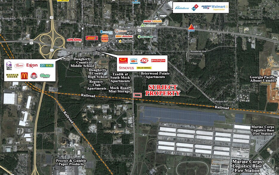 Lot is located just north of the railroad tracks and US Marine Corps Logistics Base. Conveniently situated, this location offers quick access to both Highway 82 and Highway 19. Within the area you’ll find prominent neighbors such as Super WalMart, Walgreens, Roses, USPS, Mock Road Mini Storage, and a variety of restaurants and other retail options