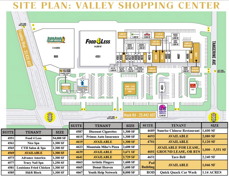 - Animé par Food 4 Less, avec un mélange de locataires nationaux et locaux, notamment Taco Bell, McDonald's, Mountain Mike's, 7 Day Tires & Auto, Dutch Bros