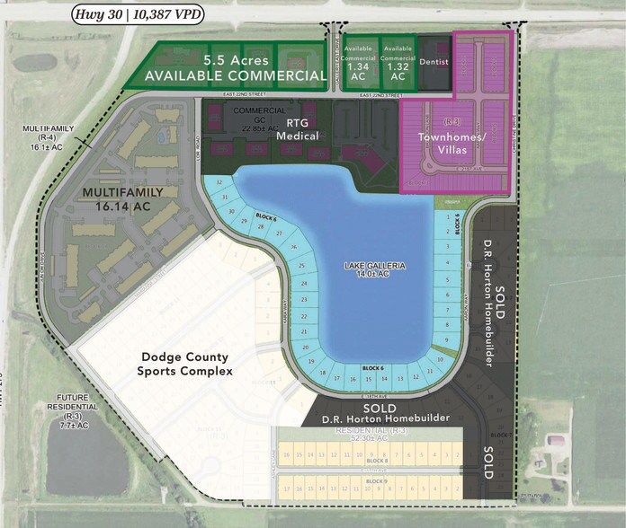 • Accès pratique et excellente visibilité depuis les autoroutes 275 et 30. Situé à quelques minutes de West Omaha. • Terrains commerciaux d'une superficie de 1,5 à 3 acres. • Les équipements sur place incluent un sentier pédestre, des maisons unifamiliales et des villas construites sur mesure et des appartements. • Situé au centre de la propriété, vous trouverez le lac Galleria, un lac de 14 acres d'une profondeur de 25 pieds, idéal pour la navigation de plaisance sans sillage.