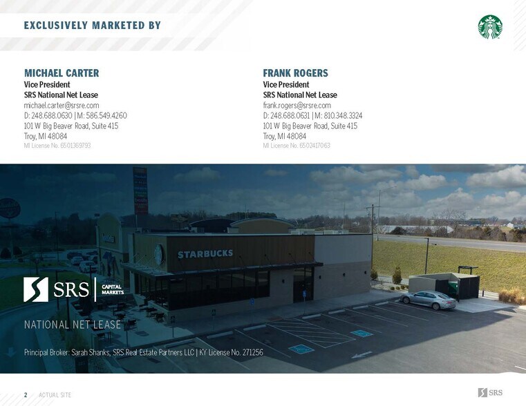 SRS National Net Lease is pleased to offer the opportunity to acquire the fee simple interest (land & building ownership) in a NN leased, drive-thru equipped, corporate signed, Starbucks investment property located in Madisonville, KY. The tenant, Starbucks Corporation, recently signed a brand new 10-year lease with 4 (5-year) option periods to extend, demonstrating their commitment to the site. The lease features 7.50% rental increases every 5 years throughout the initial term and options, growing NOI and hedging against inflation. The lease is NN with limited landlord responsibilities, making this an ideal, low-management investment opportunity for a passive investor. Founded in 1971, Starbucks is the premier roaster and retailer of specialty coffee with over 35,000 operating locations worldwide.