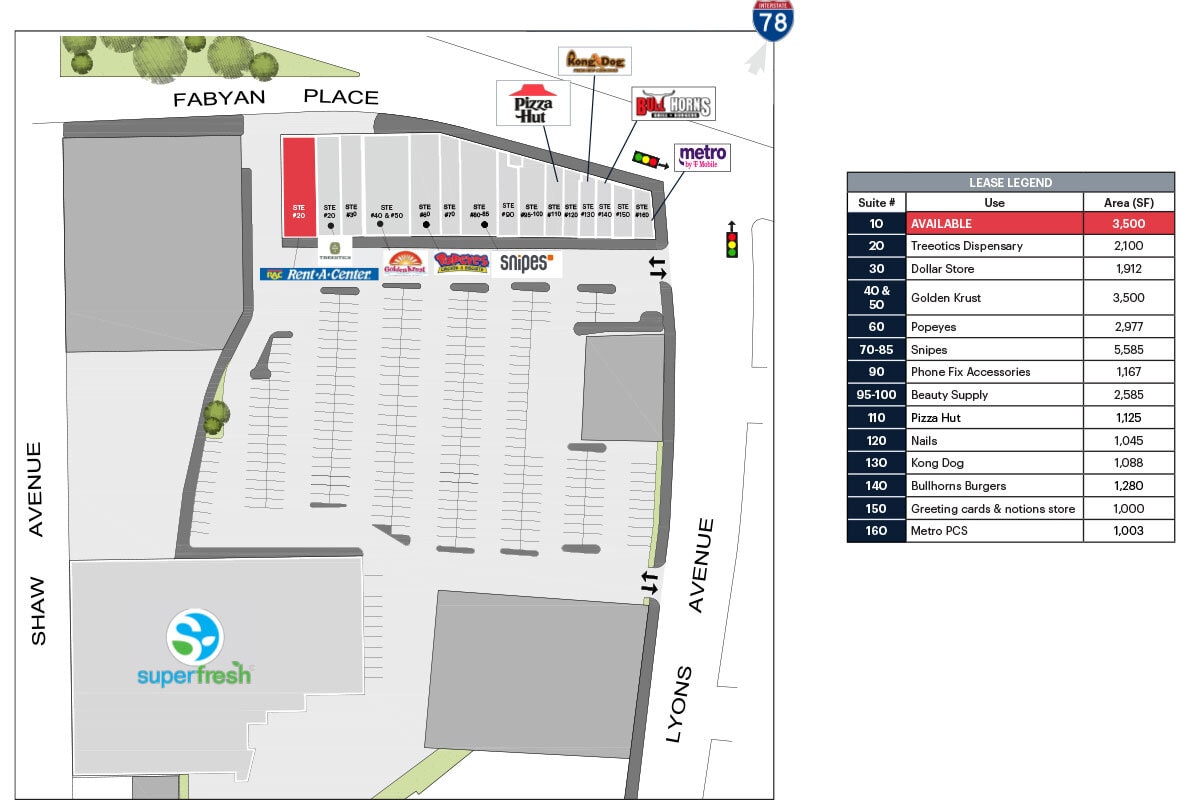 Espace de 1 167 pieds carrés - Sous-opération actuelle adaptée à un QSR, à une épicerie fine ou à une sandwicherie Colocataires : Rent-A-Center, Dollar Store, Golden Krust, Popeye's, SNIPES, Nail Salon, Metro PCS, Pizza Hut, Kong Dog, Dispensaire Treetonics Remarques et points forts : Positionnement unique sur le marché Accès régional depuis 2 autoroutes inter-États : sortie 143B du GSP, sortie 55 de l'I-78