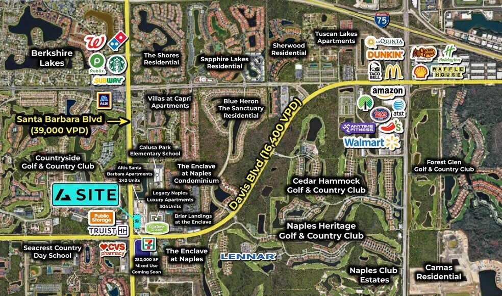 • 4706 Santa Barbara Blvd offers brand-new retail space within a high-growth corridor surrounded by luxury residential communities with flexible suite sizes, drive-thru capability, and daily traffic counts exceeding 39,000 VPD. • Drive thru endcap available • Several national tenants nearby including Whole Foods, Publix, Walmart, CVS, Bealls, Starbucks • Cross-access with 7-Eleven • Site is directly in front of Altis Santa Barbara Apartments (242 units)
