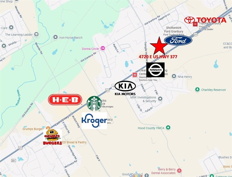 Incredible opportunity to own a high-visibility commercial tract in the heart of Granbury, Texas — voted the Best Historic Small Town in America. This property offers over 350 feet of direct frontage on Highway 377 with an estimated daily traffic count exceeding 25,000 vehicles, making it a premier location for any commercial development. Situated within Granbury city limits, this parcel is ideally positioned between major national retailers and automotive dealerships. Just east of HEB, Kroger, Starbucks, Marshalls, and Granbury Nissan & Kia — and west of Ford, Hyundai, Jeep, and Toyota dealerships — your future business will be in thriving company. Surrounded by several new and expanding residential subdivisions, this property benefits from a strong customer base and exceptional long-term growth potential. Mature oak trees offer natural beauty and shade, while the rectangular shape and level topography provide flexible design options for development. Ideal for a variety of commercial uses, including, Automotive Sales, Gas Station, Office Building, Church, Industrial, Manufacturing, Warehouse or Distribution Center. Don’t miss your chance to secure a rare, high-traffic location in one of Texas’ most desirable small-town markets. This is THE spot for your next business endeavor.