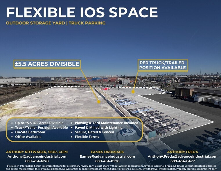 Listing Page: www.Advanceindustrial.com/474-wilson 474 Wilson Avenue in Newark offers ±5.5 demisable acres of secure Industrial Outdoor Storage (IOS) space, ideal for truck, trailer, chassis, or container parking. The property features flexible leasing options — tenants can lease per truck position, per acre, or the entire site. The property includes optional ±15,000 SF warehouse and ±4,000 SF office space, providing additional on-site logistics and administrative functionality. With immediate access to US 1&9, I-78, NJ Turnpike (I-95), and Port Newark/Elizabeth, this property sits at the heart of New Jersey’s logistics corridor — perfectly positioned for drayage operators, freight carriers, and storage users. The site is fully fenced, gated, and illuminated, ensuring security for high-value equipment and cargo.