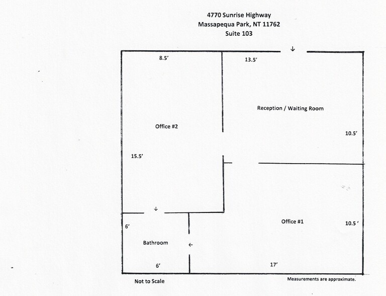 Approx. 600 sf Office Suite, located on Sunrise Highway, across from Massapequa Park LIRR station. Suite contains 2 offices, reception/waiting area, private bath. Great visibility, 50-car parking lot, exterior signage. Rent ($1,800/month) includes everything, except WiFi (utilities, CAM, base-year taxes, etc.). Great space for attorney/accountant/therapist/etc. Available 5/1/26.