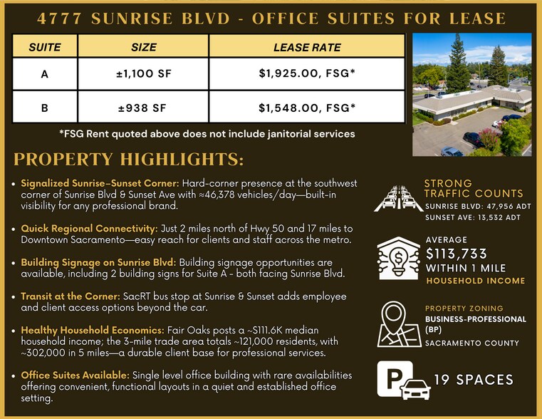 Professional office suites available for lease at 4777 Sunrise Blvd in Fair Oaks—a highly visible hard-corner location at the signalized intersection of Sunrise Blvd and Sunset Ave. This single-story office building offers two functional suite options ranging from ±938 to ±2,038 SF, ideal for professional service firms, medical practitioners, financial advisors, or any business that benefits from strong street presence. With full-service gross lease pricing, building signage on Sunrise Blvd, and 19 dedicated parking spaces, tenants enjoy a turnkey office environment in one of Fair Oaks' most established corridors. The property sits just 2 miles north of Highway 50, providing quick connectivity to Downtown Sacramento and the greater metro area.