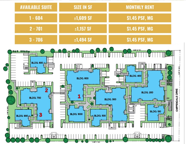 Un environnement professionnel et pratique adapté à votre bureau d'affaires. Le parc de bureaux de Chippendale comprend dix bâtiments distincts bien situés et dotés d'un aménagement paysager mature. Chaque bâtiment dispose d'un parking pratique. Le bâtiment 600 possède des toilettes récemment rénovées. En outre, les toilettes du bâtiment 700 devraient être rénovées au cours des six prochains mois. Cet établissement est facilement accessible depuis l'Interstate 80 via Madison Avenue.