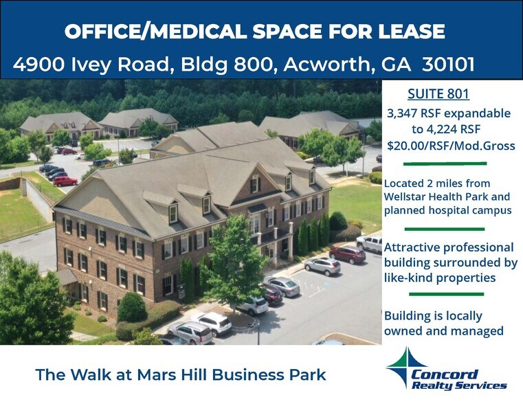Suite 801 at Building 800 offers a professional office environment within The Walk at Mars Hill, a well-located business park in Acworth, Georgia. The available terrace level suite totals 3,347 RSF and features an efficient layout including a conference room, break/kitchen area, and a large open work area, providing an excellent environment for professional office or medical users. An adjacent 877 RSF first-generation space (Suite 800-B) is also available and can be combined with Suite 801 to create a total contiguous space of up to 4,224 RSF, allowing a tenant to expand or customize the space to meet their needs. The suite offers convenient access through the building’s interior common areas as well as two exterior entrances, providing flexibility for both traditional office users and medical service providers. Constructed in 2007, Building 800 is a three-story, 18,000 square foot office building and the largest building within the park. The property features high-quality finishes in the common areas and in many of the individual office suites, elevator access to all floors, and ample free surface parking on both sides of the building for tenants and visitors. The property is ideally positioned just minutes from U.S. Hwy 41/Cobb Parkway NW and offers convenient access to Interstate 75, providing connectivity to the surrounding communities of Kennesaw, Woodstock, and Marietta. The location is surrounded by numerous retail amenities, restaurants, and service providers along the Cobb Parkway corridor. Building 800 is also ideally located to benefit from significant healthcare expansion in the immediate area. Wellstar Health System has received state approval for the construction of a new $1 billion hospital campus in Acworth, located approximately two miles from the property. This major healthcare investment is expected to attract additional medical practices and healthcare-related services to the corridor. In addition, Piedmont Healthcare is developing a new medical facility at The Walk at Mars Hill, further strengthening the area as a growing hub for healthcare and professional services.