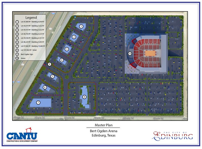 Les 10 acres de terrain disponibles feront partie du Courtside at Arena Center. La propriété peut être divisée en lots et/ou bâtiments plus petits, veuillez vous référer aux brochures ci-jointes pour plus d'informations.