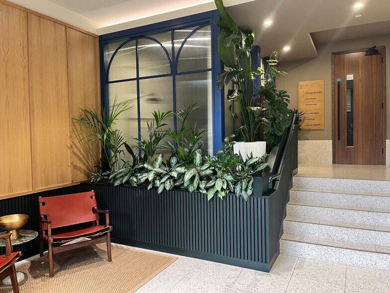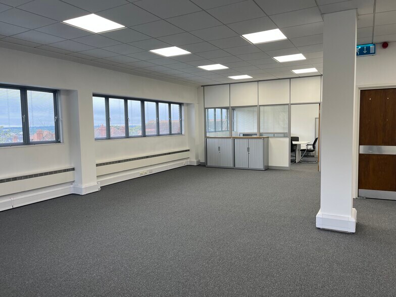 A contemporary office suite located on the second floor, offering excellent natural light with dual aspect windows. The space features an open plan layout, along with a partitioned boardroom/office that can be adjusted to meet tenant needs. The suite is equipped with modern amenities, including suspended ceilings with LED lighting, air conditioning, new carpeting, Cat 5 data cabling, central heating, an open plan kitchen, and video door entry. The building's common areas have undergone extensive refurbishment, with shared reception. The suite also includes two parking spaces.