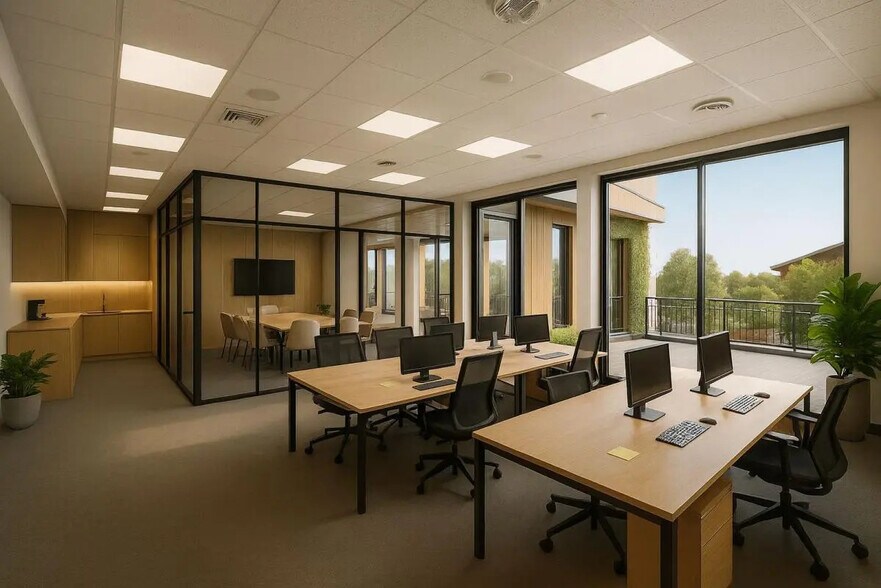 Ce plateau du deuxième étage se distingue par son ambiance lumineuse et sereine, idéal pour des équipes nécessitant calme et concentration. Livré neuf, il dispose des mêmes prestations que les autres lots : moquette haute qualité, faux plafond acoustique, stores intérieurs et infrastructure télécom complète. Sa surface équilibrée facilite la création de zones distinctes (réunion, open space, postes individuels).