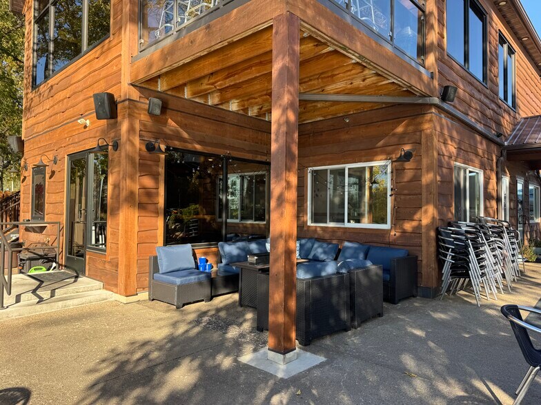 The main level features an inviting bar area with high-top seating, televisions, pull-tab machines, and restrooms, creating the perfect casual atmosphere. The outdoor space is designed to maximize enjoyment during the spring, summer, and fall seasons. Guests can relax with ample seating, take in the views, and enjoy live entertainment from the covered stage, which is equipped with lighting and sufficient electrical capacity. Stainless steel rail seating adds to the functionality and appeal of the outdoor space.