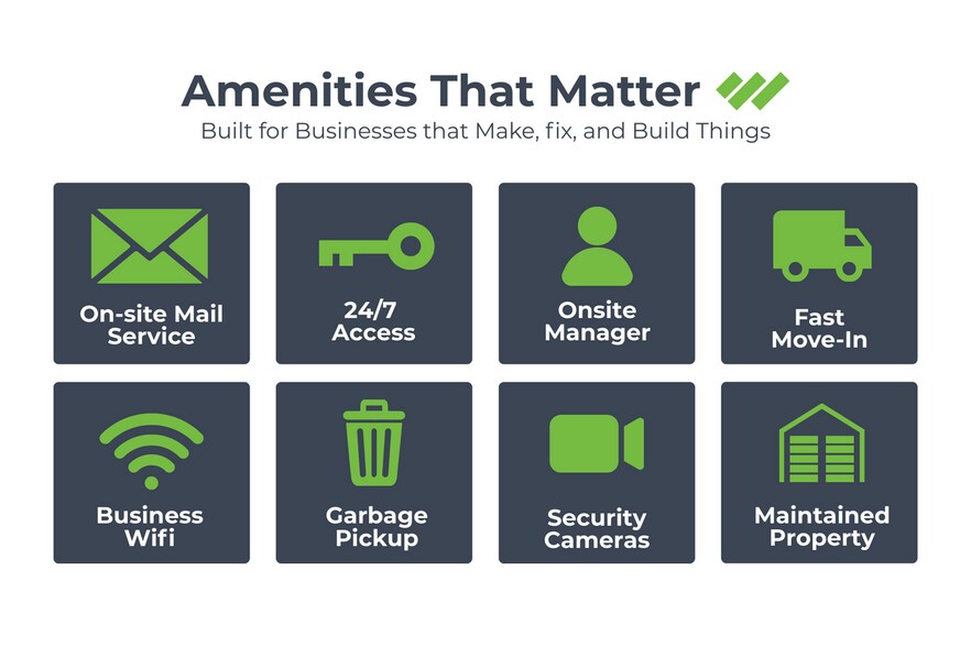 - Every unit's warehouse space includes 3-phase power, a roll-up door, private entry, and a private restroom for convenient day-to-day operations.