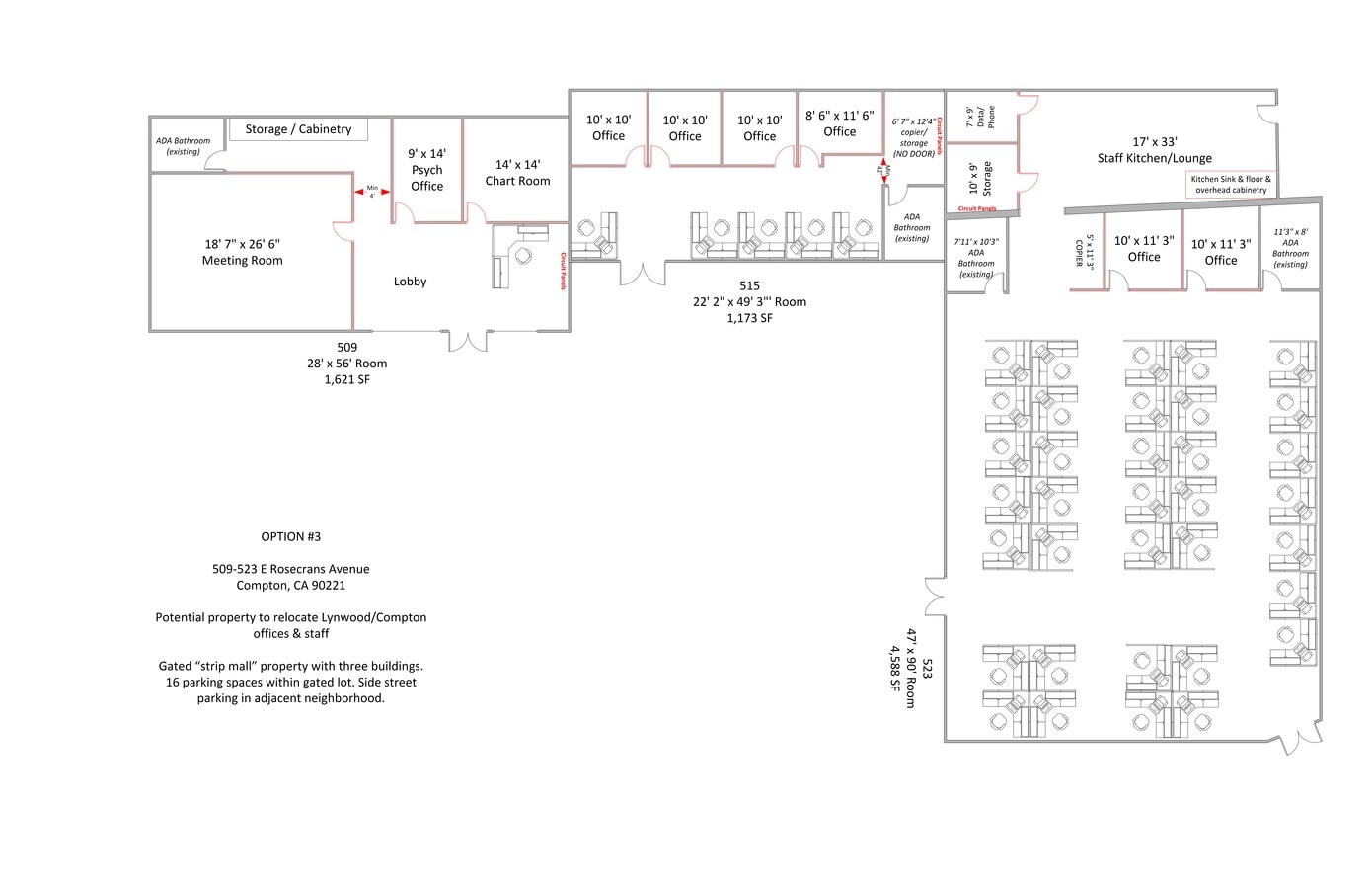Vacant commercial property available for an owner-user or investor. Great property on a busy street that has a variety of potential uses. Gated Office Complex formerly occupied by the Children’s Institute Inc (Cii) which was formerly Rosecrans Shopping Center in the City of Compton. Fully built out modern office space features new construction with an remote-controlled gate for secure access to parking lot including 17 parking spaces on a 19,000 sf landscaped lot. The interior include carpeting, polished concrete floors, ADA bathrooms, lots of electrical service, ample window glass space, and signage rights to the large monument sign. Location Features: Great space for non-profit corporations and local, regional, and national companies looking for a safe, secure, and clean property for their business. Just a few blocks away from Long Beach Blvd with lots of restaurants and local businesses.