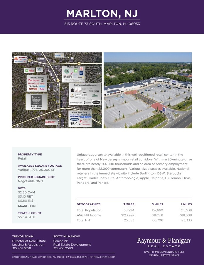 Unique opportunity available in this well-positioned retail center in the heart of one of New Jersey’s major retail corridors. Within a 20-minute drive there are nearly 144,000 households and an area of primary employment for more than 22,000 commuters. Various-sized spaces available. National retailers in the immediate vicinity include Burlington, DSW, Starbucks, Target, Trader Joe’s, Ulta, Anthropologie, Apple, Chipotle, Lululemon, Orvis, Pandora, and Panera.