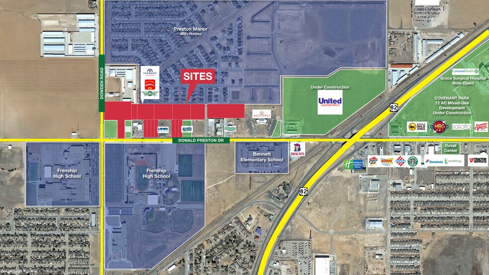 This offering consists of multiple land parcels that may be purchased individually or as a combined assemblage totaling approximately 21 acres, with parcel sizes starting at 0.48 acres. Several tracts feature frontage along Donald Preston Drive, a major arterial in the rapidly growing Southwest Lubbock/Wolfforth corridor. The property is located directly across from Frenship High School and is surrounded by significant new residential and commercial development. Nearby projects include the 72-acre Covenant Park mixed-use development currently under construction, anchored by Grace Surgical Hospital with planned retail and restaurant users. Additionally, a new United Supermarkets is scheduled to break ground in early 2026, further strengthening the area’s long-term growth and visibility.
