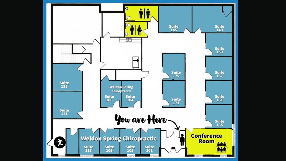 Rénové récemment Accès par carte-clé au bâtiment et aux bureaux individuels Salle de conférence partagée, branchements informatiques pour affichage sur un téléviseur à écran plat Cuisine et salle de repos communes Cuisine et salle de bain nettoyées par des professionnels 400$ pour les suites bureautiques 153 175 171 450$ pour les suites bureautiques 165 161 157 500$ pour les suites bureautiques 149 145 121 125 • 40 places de stationnement disponibles • Excellente proximité des commodités : restaurants, hôtels, parcs, etc. • À environ 2,5 km de l'hôpital BJC Progress West • Accès facile depuis l'I-64/40 et l'autoroute 94