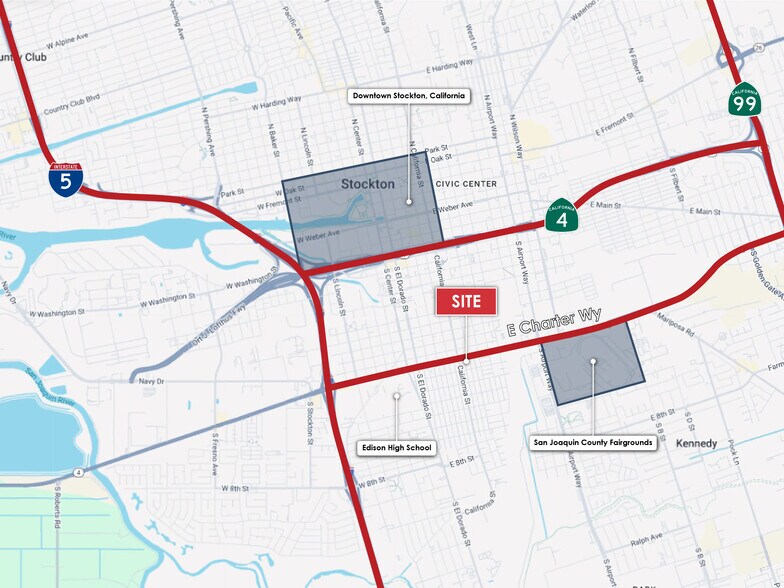 - Centrally located near I-5, Hwy 99, SR-4, and E Charter Wy with over 300K vehicles passing daily.