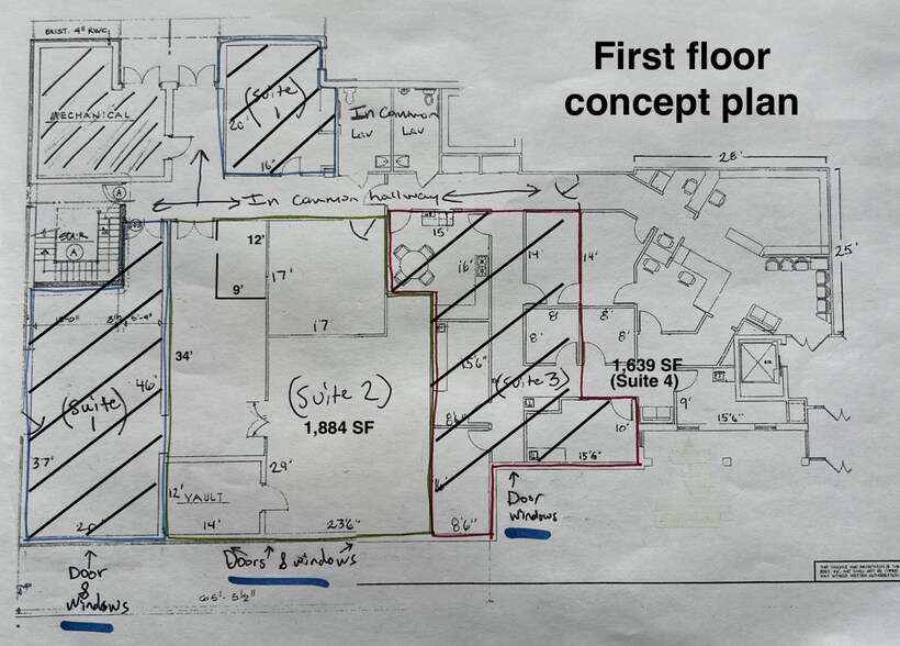 First floor storefront retail/office space. Two suites available: 1,884SF(Suite 2) and 1,639SF (Suite 4). Exterior building access. See exterior building concept plan.