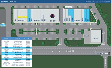 Shad Landing est un centre commercial de quartier de 62 900 pieds carrés situé sur Shad Road, juste à l'ouest de l'autoroute Philips (US 1), desservant le sous-marché animé Mandarin de Jacksonville. Construit en 2005, le centre comprend des espaces de vente au détail, des bureaux et des salles d'exposition polyvalents à partir de 1 000 pieds carrés, avec des options d'espace contigu pour les locataires ayant besoin d'une plus grande superficie. Shad Landing comprend deux bâtiments commerciaux principaux, abritant une gamme de locataires diversifiée qui comprend Dollar General, une garderie indépendante, un café, un dépanneur, un nettoyeur, des services de salon de beauté, etc.