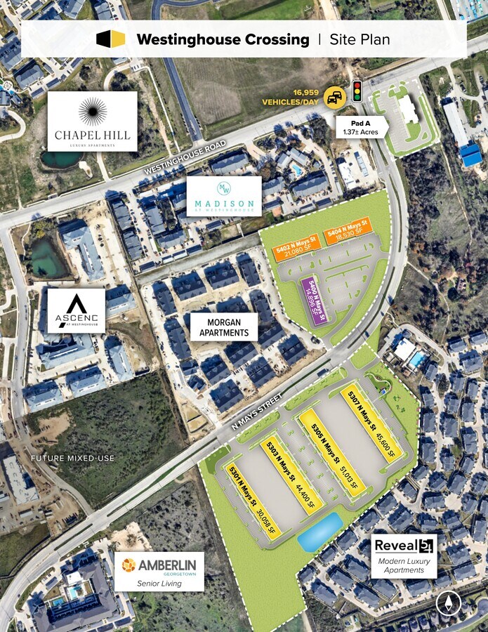 Westinghouse Crossing est un modèle du produit Flex/R&D emblématique de St. John Properties. St. John est une entreprise nationale réputée pour sa qualité supérieure, son efficacité et sa polyvalence. L'entreprise verticalement intégrée est fière de fournir des produits de premier ordre et un service client adaptés aux utilisateurs innovants. Les locataires de quasi-commerces de détail, les entreprises technologiques, la R&D, les services professionnels, les ateliers créatifs et bien d'autres peuvent trouver un endroit où s'épanouir à Westinghouse Crossing. Au total, le parc de sept bâtiments comprend plusieurs types de produits zonés C3 avec des espaces allant d'environ 2 600 pieds carrés à des bâtiments complets pour les grands utilisateurs. Il existe quatre bâtiments de R&D flexibles d'une superficie de 30 000 à plus de 50 000 pieds carrés ; ils présentent une hauteur libre de 18 pieds, une construction inclinable, des quais de chargement et des drive-ins. Les deux immeubles de bureaux d'un étage s'étendent sur 18 530 et 21 080 pieds carrés avec une hauteur libre de 10 pieds et une construction brique sur bloc. Le bâtiment commercial mesure 14 896 pieds carrés et possède la meilleure façade du parc, et une Parcelle de terrain vacant d'angle de 1,37 acre est disponible à l'intersection signalisée. St. John loue, gère et détient ses propriétés, ce qui signifie que les locataires peuvent toujours s'attendre à un service de la plus haute qualité et ne jamais être confiés à un opérateur inconnu. Un guichet unique qui vous permet de continuer à vous concentrer sur vos activités commerciales pendant qu'ils s'occupent de vous fournir votre nouveau domicile professionnel de premier ordre. En plus de son équipe interne d'experts en gestion immobilière, St. John a intégré le service, l'aménagement intérieur et la construction autonome afin de fournir un processus d'amélioration efficace pour les locataires afin de permettre des livraisons clés en main rapides, dans le respect des délais et du budget. Georgetown et Round Rock sont des pôles florissants tournés vers l'avenir qui s'appuient sur le goût novateur d'Austin. Malgré cela, la région manque d'espaces fonctionnels et créatifs offrant la qualité attendue par les entreprises pionnières, ce qui fait de ce modèle le premier du genre dans la région. Westinghouse Crossing place les locataires là où tout se passe, grâce à son emplacement central à la frontière de Georgetown et Round Rock, les villes qui se sont classées respectivement 4e et 15e pour la croissance démographique sur un an entre 2022 et 2023. Cette croissance se poursuit à un rythme effréné, attirant des équipements et des entreprises qui cherchent à exploiter les bassins de résidents riches et instruits. Environ 800 000 pieds carrés d'espace commercial ont été construits à moins d'un kilomètre de Westinghouse Crossing entre 2020 et 2024, activant ainsi le paysage urbain grâce à des équipements accessibles à pied. La proximité de l'Interstate 35 permet d'accéder à un plus grand nombre de destinations de style de vie et de centres professionnels tels que Tech Ridge, le Parmer Center, les principaux hôpitaux, le centre-ville d'Austin et Cedar Park.