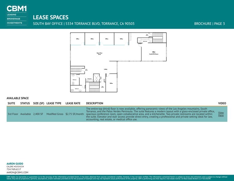 The entire top (third) floor is now available, offering panoramic views of the Los Angeles mountains, South Torrance, and the Palos Verdes Peninsula. The suite features a modern layout with a glass-enclosed private office, spacious conference room, open collaborative area, and a kitchenette. Two private restrooms are located within the suite. Elevator and stair access provide direct entry, creating a professional and private setting ideal for law, accounting, real estate, or medical office use.
