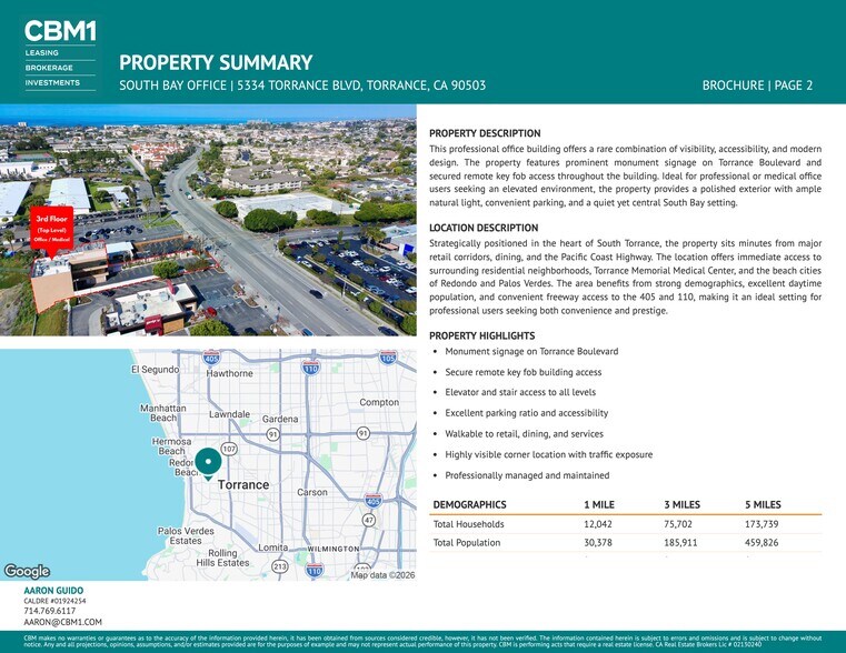 This professional office building offers a rare combination of visibility, accessibility, and modern design. The property features prominent monument signage on Torrance Boulevard and secured remote key fob access throughout the building. Ideal for professional or medical office users seeking an elevated environment, the property provides a polished exterior with ample natural light, convenient parking, and a quiet yet central South Bay setting. Strategically positioned in the heart of South Torrance, the property sits minutes from major retail corridors, dining, and the Pacific Coast Highway. The location offers immediate access to surrounding residential neighborhoods, Torrance Memorial Medical Center, and the beach cities of Redondo and Palos Verdes. The area benefits from strong demographics, excellent daytime population, and convenient freeway access to the 405 and 110, making it an ideal setting for professional users seeking both convenience and prestige.