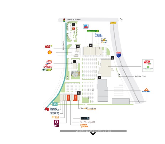 Le district Beauharnois est situé à la sortie 26 de l'autoroute 30, à l'intersection du chemin de la Beauce et du boulevard Cadieux à l'entrée de la ville. Ancré par IGA et Canac, ce nouveau centre de services est le plus grand centre commercial de la ville de Beauharnois, une ville qui connaît une forte croissance démographique, des projets résidentiels et des projets industriels.