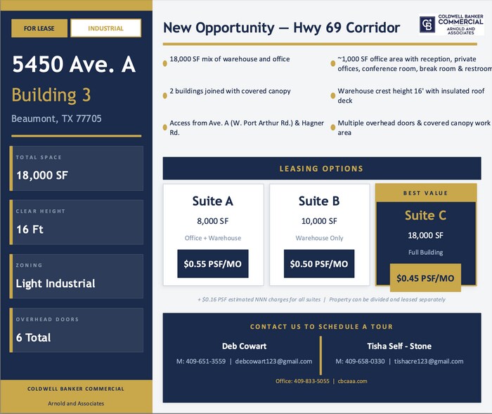 New Opportunity right off Hwy 69 Corridor Property can be divided and leased separately • 18,000 SF mix of warehouse and office • Access available from Avenue A (W. Port Arthur Road) and Hagner Rd. • Approximately 1000 sf office area on east end of bldg. includes reception area, privacy offices, conference room, break room and restroom. • Warehouse crest height 16’, insulated roof deck, multiple overhead doors & covered canopy work area. • Light Industrial Zoning FOR LEASE $0.50 psf. **Includes taxes and insurance**