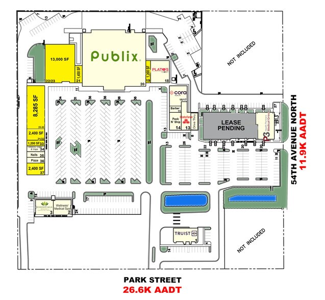 Espace commercial à louer dans le centre commercial Eagles Park, propriété de Gator Investments, à Saint-Pétersbourg, en Floride. Ce centre commercial ancré à Publix est situé au nord de l'Alt Rte. 19 sur Park Street North et de la 54e Avenue North dans le comté de Pinellas. Les locataires nationaux incluent Truist, State Farm et Plato's Closet. Espace d'ancrage junior, en ligne et à embout disponible à la location.