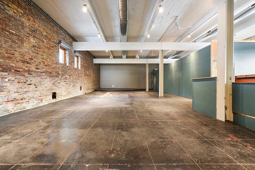- Espace ouvert avec de hauts plafonds et des briques apparentes.