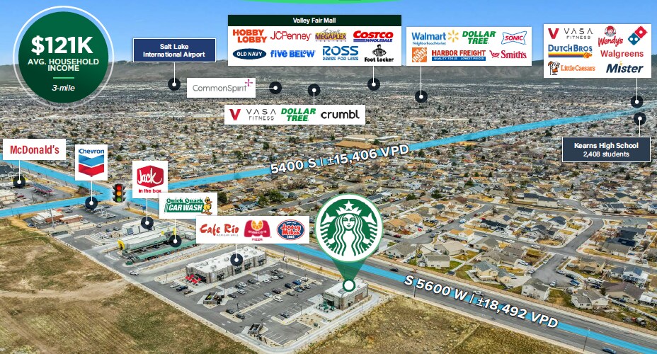 Marcus & Millichap is pleased to present a newly constructed freestanding Starbucks drive-thru located along 5600 West (SR-172), one of West Valley City’s most heavily trafficked north–south arterials. The site benefits from exceptional visibility, strong commuter flow, and proximity to major employment centers including Salt Lake City International Airport, Downtown Salt Lake City, and the region’s extensive industrial and logistics corridor.
