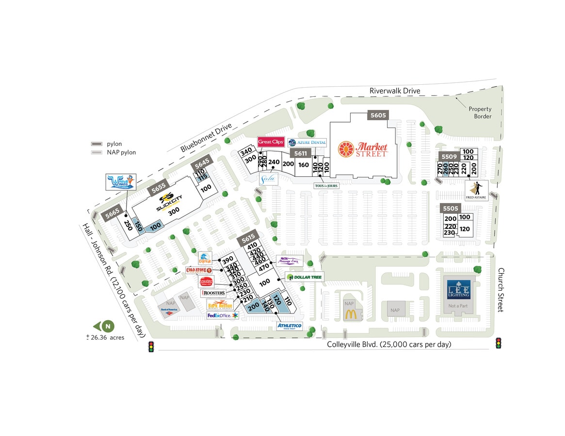 - Rejoignez les locataires existants : Market Street, Cold Stone Creamery, FedEx Office, AT&T Wireless, Massage Envy, Great Clips, Pet Supermarket, Azure Dental.