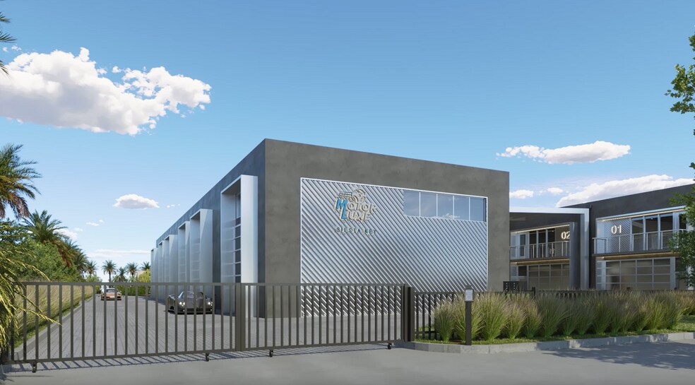 Introducing MotorLuxe Suites Siesta Key, an owner-only private garage community for the high-end automotive lifestyle, currently in pre-construction at 5755 Bessie Drive. The property features a private road with dual secured entry gates providing controlled access to 13 individually owned garage condominiums. Situated on Clark Lake, seven waterfront units offer approximately 1,152 square feet (24 feet wide by 48 feet deep) and feature a fully insulated, motorized garage door (14 feet wide by 10 feet high) with a separate pedestrian entry door, two private balconies, and 24-foot ceilings.
