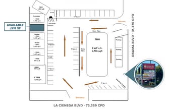 Highly Visible ± 918 SF Salon Space Available in high performing strip center at the Busy Signalized intersection of Obama & La Cienega Blvd. Exceptional Traffic Counts (± 106,729 Cars Per Day). Blocks away from newly constructed Cumulus Mixed-Use project, one of the largest Mixed-Use projects in the region with more than 1,200 residential units and over 100,000 SF of retail, anchored by Whole Foods. Surrounded by major retailers, shops and restaurants including Target, CVS, Starbucks McDonalds and more. Within 0.5 miles of the La Cienega/Jefferson Metro Station. Dense Population Demographics