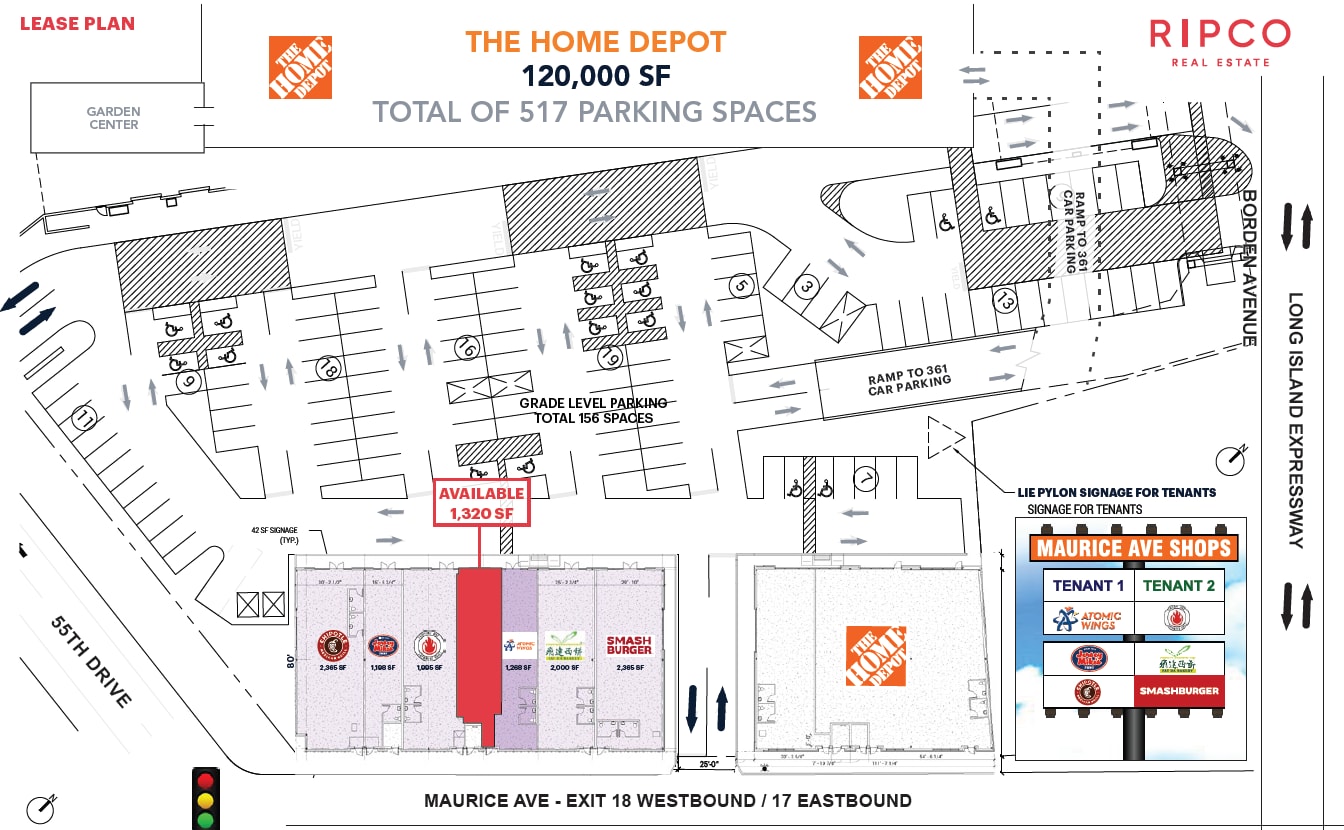 Centre commercial récemment construit, ancré par Home Depot, Chipotle, Smashburger, Jersey Mikes, Teriyaki One et Fay Da Bakery. Juste à côté de la LIE, sur la sortie 18, avec une opportunité de signalisation incroyable (superbe signalisation sur les pylônes visible depuis le BQE). L'emplacement offre une composition diversifiée de locataires et une forte démographie de la région. Toutes les utilisations sont les bienvenues !