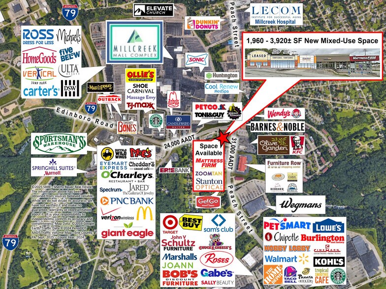 Nouvelle construction de 2 149 à 6 478 ± pieds carrés à louer sur Peach Street, le principal corridor commercial et de services du Grand Érié. Disponible à l'automne 2025. À livrer sous forme de boîte blanche avec toilettes ADA avec façade vitrée de 18'8 pouces. L'unité Endcap comprendra également deux fenêtres de 19 pieds 4 pouces de large sur le côté du bâtiment faisant face à Marmon Drive. Peut être combiné pour 4 319 ± SF (2 unités) ou 6 478 ± SF (3 unités). Plans disponibles. Rejoignez Stanton Optical, Zoom Tan & Mattress Firm. L'établissement est adjacent au centre commercial Millcreek, à Barnes & Noble, au KFC et à plusieurs grands détaillants. Excellente visibilité avec 32 000 véhicules par jour le long de Peach Street (année de comptage PennDOT AADT 2023). Signalisation par pylône et nombreux parkings disponibles. Espace idéal pour une utilisation mixte. Zoné C1, corridor commercial (canton de Millcreek). Offert à 33,00 $/SF/AN - NNN. NNN estimé à 8,33 $/SF/AN sur la base de 2024. Contactez le courtier pour plus d'informations.